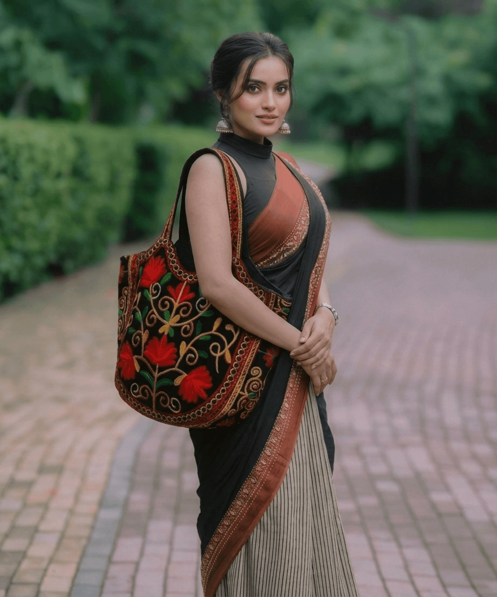 Handcrafted in Kutch, Gujarat, this cotton tote bag showcases vibrant red floral embroidery set against a classic black base. The elegant vine patterns create a timeless ethnic look while the spacious design ensures practical everyday use. Lightweight yet durable, this bag beautifully combines traditional artistry with modern functionality.