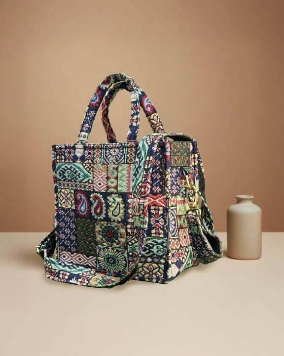 This jacquard handbag reflects the city’s enduring textile legacy—where colour, geometry, and storytelling meet on the loom. The intricate patchwork-style motifs are created through traditional jacquard weaving, allowing patterns to emerge from the structure of the fabric itself rather than surface embellishment.